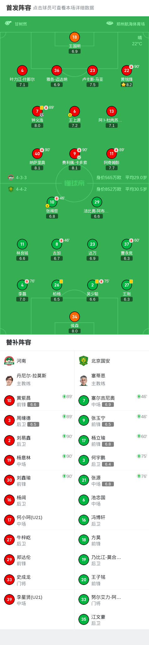 9月12日中超联赛第24轮,河南坐镇主场迎战北京国安。上半场,曹永竞凌空射门击中横梁,法比奥错失机会,钟义浩错失机会后补射破门打破僵局,侯森做出精彩扑救;下半场,张玉宁击中立柱,柏杨送点,卡多索点射锁定胜局。最终,河南主场2-0送国安两连败。关键事件第40分钟,钟义浩补射发生折射破门,河南1-0领先国安!第85分钟,柏杨送点,卡多索点球破门,国安0-2落后河...